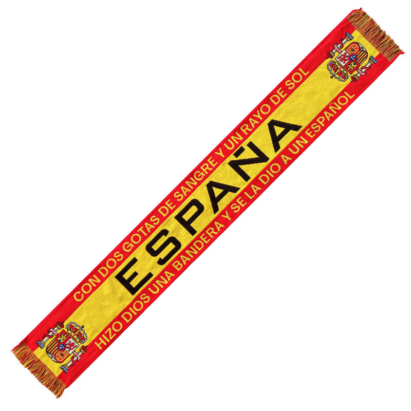Luce tu orgullo nacional con esta bufanda de 130 x 20 cm en rojo y amarillo, con la palabra “ESPAÑA” en grande en el centro y el lema “CON DOS GOTAS DE SANGRE Y UN RAYO DE SOL HIZO DIOS UNA BANDERA Y SE LA DIÓ A UN ESPAÑOL” recorriendo toda la pieza. En cada extremo incluye el escudo de España sobre fondo rojigualdo, rematado con flecos dorados que le dan el estilo clásico de bufanda futbolera, ideal para gradas, balcones, manifestaciones y concentraciones patrióticas.