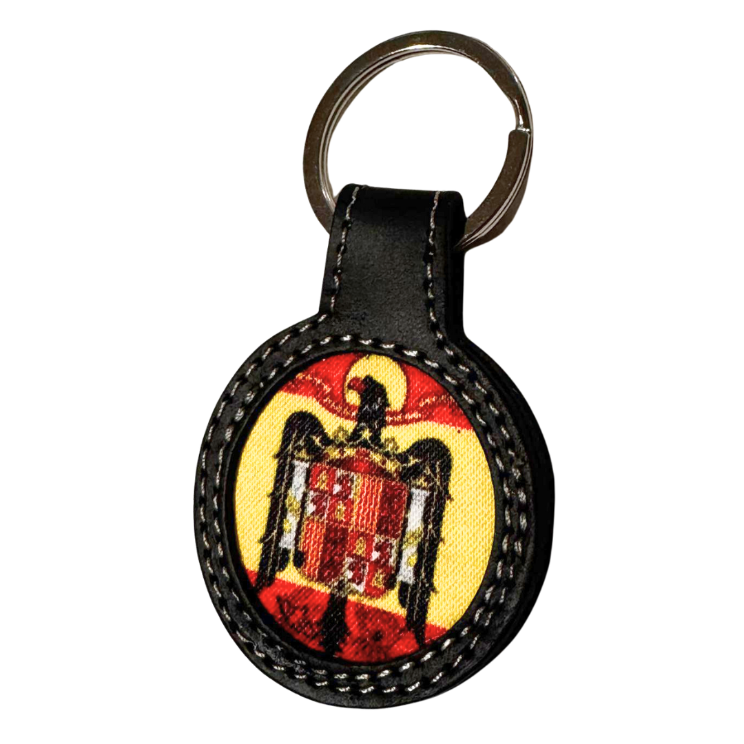 Este llavero de piel con Águila de San Juan es el complemento perfecto para quienes quieren llevar siempre consigo un símbolo histórico de España con estilo y resistencia. Fabricado en piel negra con pespuntes vistos y pieza central redonda en tejido estampado, combina los colores rojo y amarillo con el águila y el escudo al frente, creando un diseño elegante y muy patriota, ideal para llaves de casa, coche o mochila.